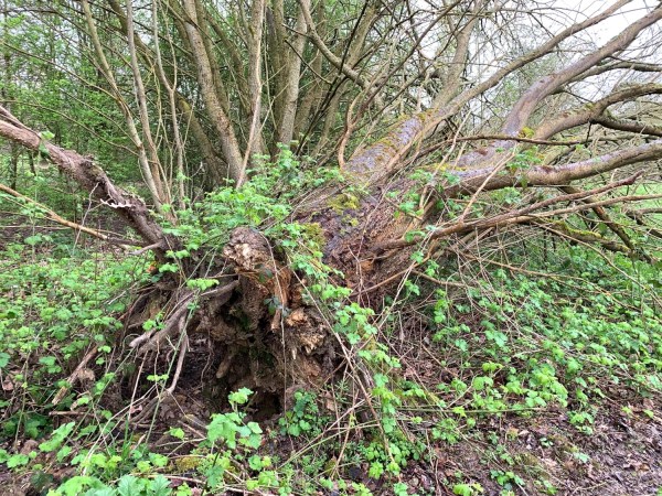 A combination of waterlogged roots and high winds brought down an old and decaying goat willow (Salix caprea) on the edge of the Arboretum, near the oak with the chestnut paling fence. Last week, the Wednesday work party spent the morning cutting back the branches and using them to build wildlife sanctuaries.