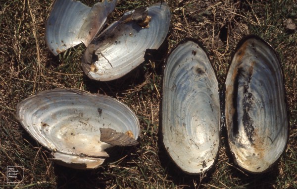 Swan mussels have growth rings on their shells, inside and out, and you can tell a mussel’s age by counting the rings, just like counting the growth rings in a tree trunk.