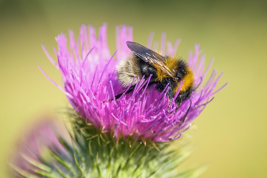 This is a garden bumble bee (Bombus hortorum) collecting nectar in a spear thistle flower at the edge of the large pond.