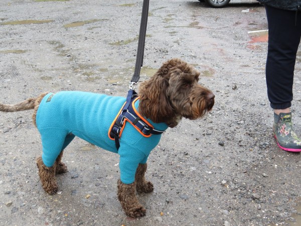 Coco, Dog of the Week, all wrapped up against the weather, taking her human for a walk in the rain.