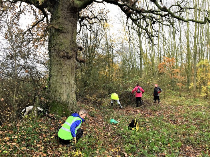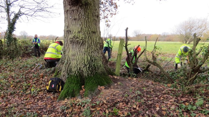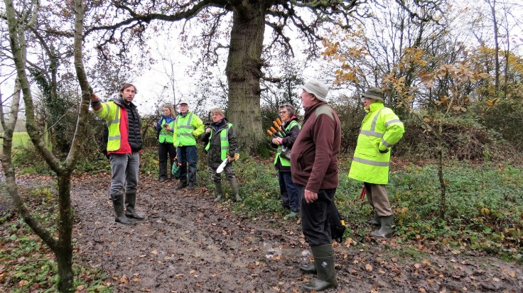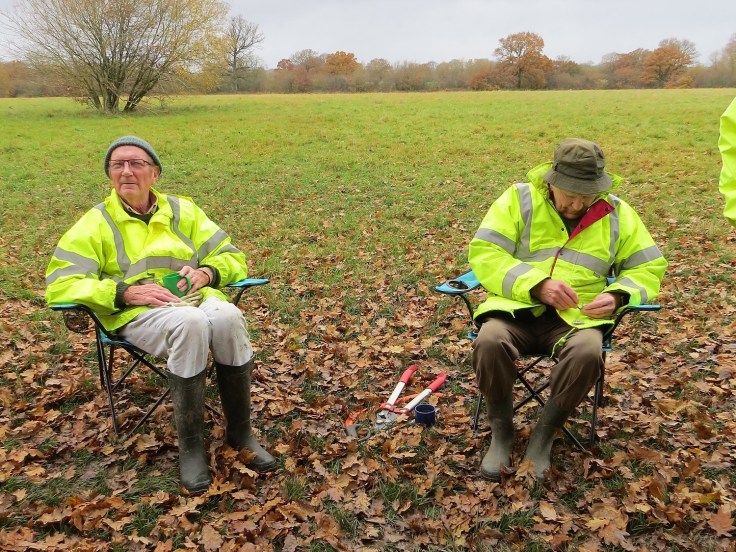 Tuesday’s work party was devoted to veteran oak tree 5549. We halo our old oaks; this means that we clear away the under-storey that competes for their light and nutrition and build barriers around them to reduce footfall over their roots. Hard work!
