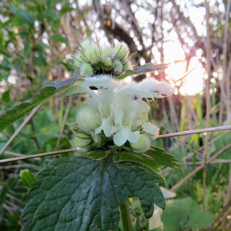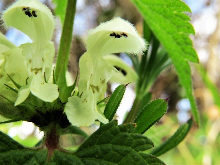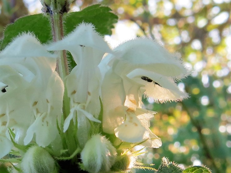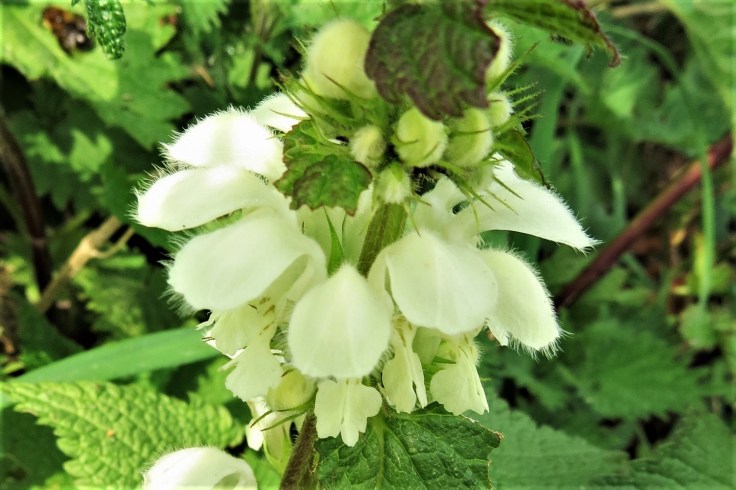 The extraordinary flowers of white dead nettle (Lamium album); find them in our hedges and edges, besieged by pollinators.