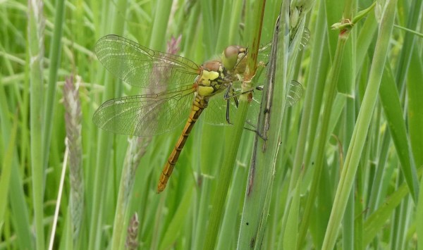 I think this is a very recently emerged female Ruddy Darter – Sympetrum sanguineum – taken on Friday June 7th near the reserve’s big pond.