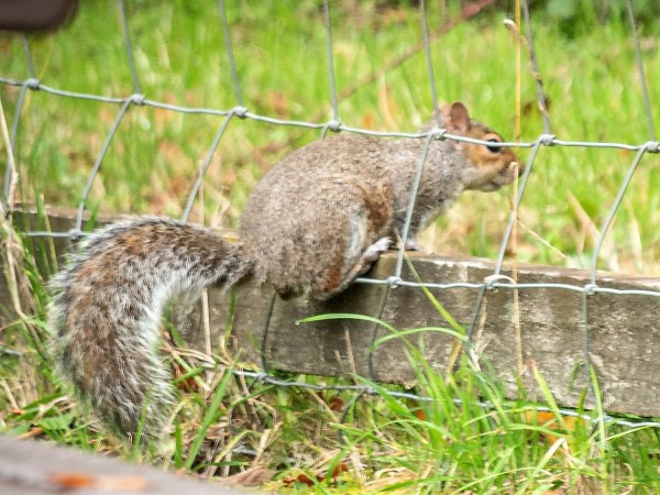 Read on:A grey squirrel, photographed by DKG, leaving the picnic area through the fence. Perhaps he has been burying acorns there, for a winter picnic of his own.