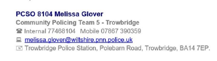 PCSO Mat Till’s email address is Matthew.Till@wiltshire.pnn.police.uk.
