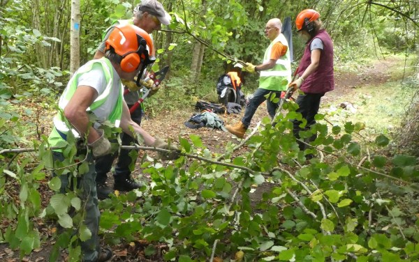 The morning’s task was to cut, prepare and store enough hazel stakes to provide the structure for dead hedges to protect the banks and streams on either side of the footbridges into Studley Close and Village Green.